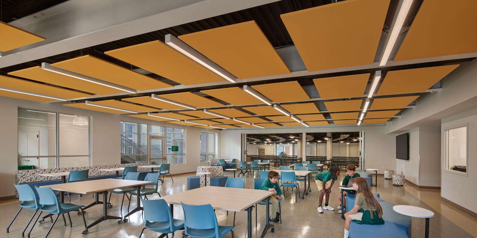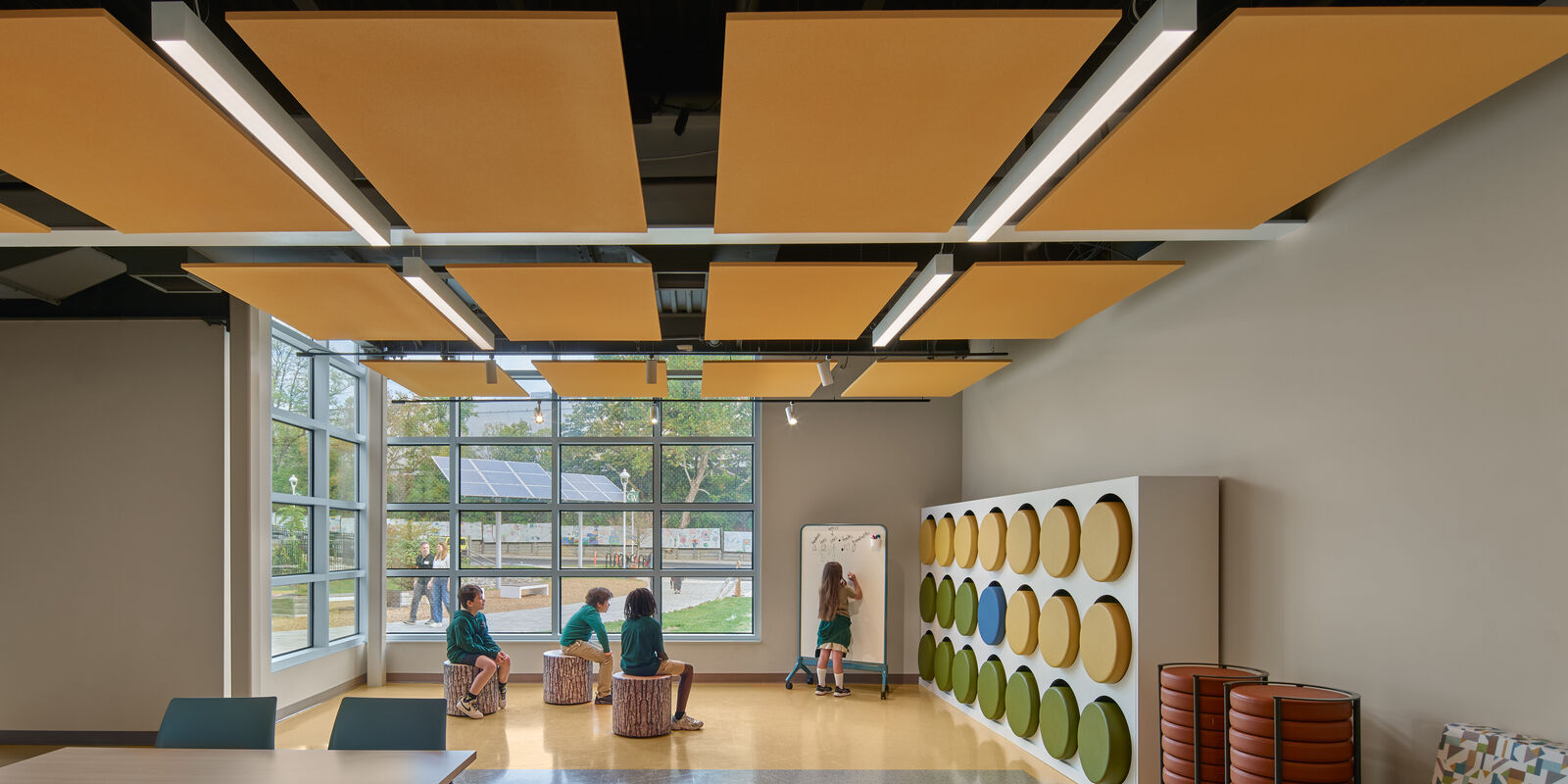 The two-story, 5,104-SF addition houses a large multi-purpose room, as well as a STEM lab, greenhouse, collaborative learning spaces, and an environmental science classroom with space for their recycling program.