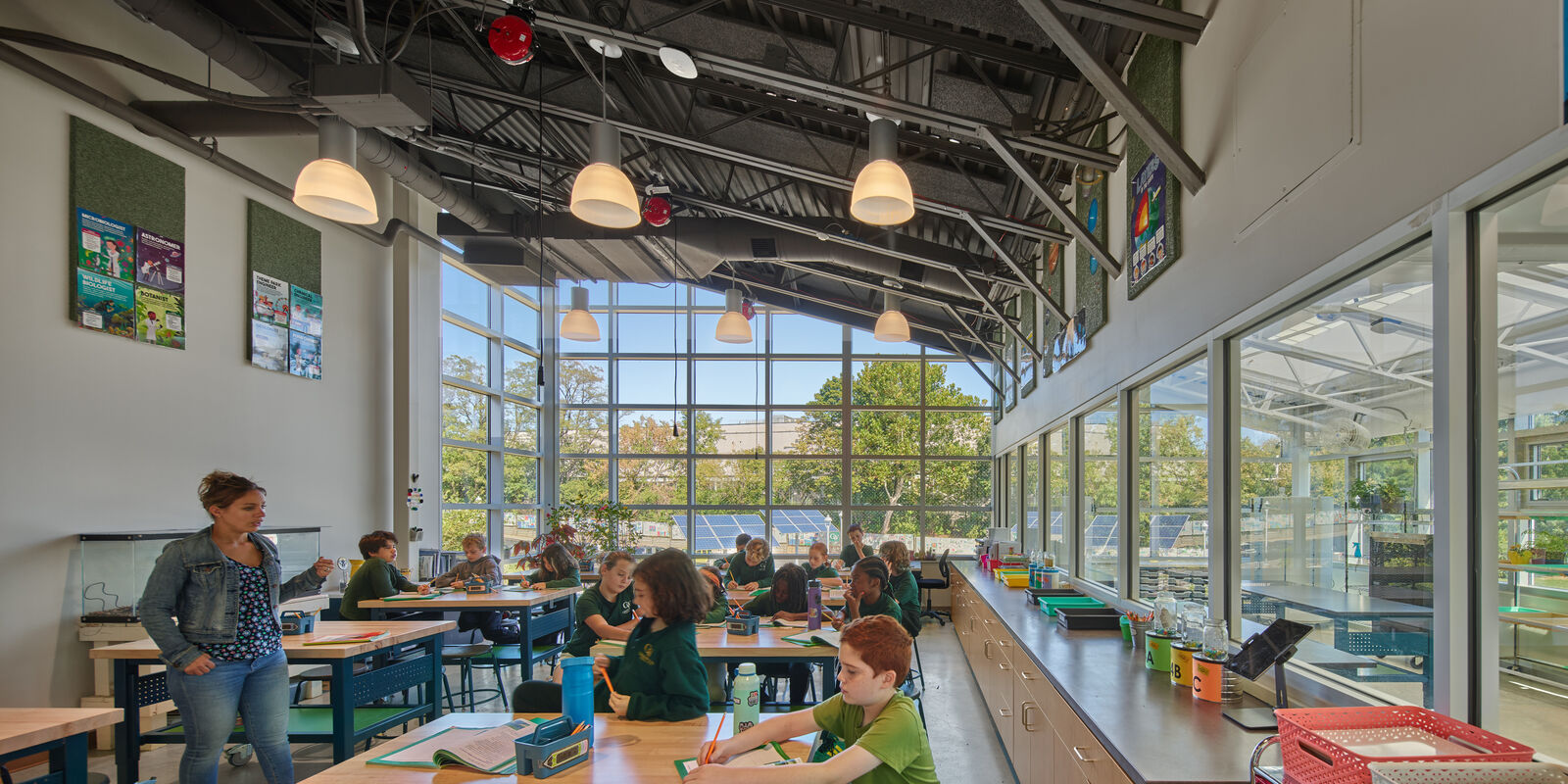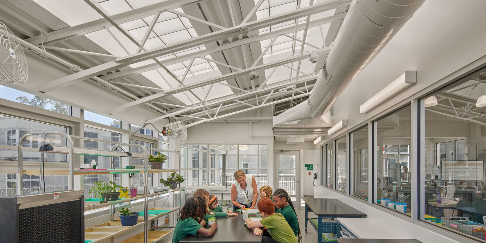A greenhouse-inspired design creates a light-filled experience for students as they investigate and learn, creating dedicated spaces for hands-on environmental learning.